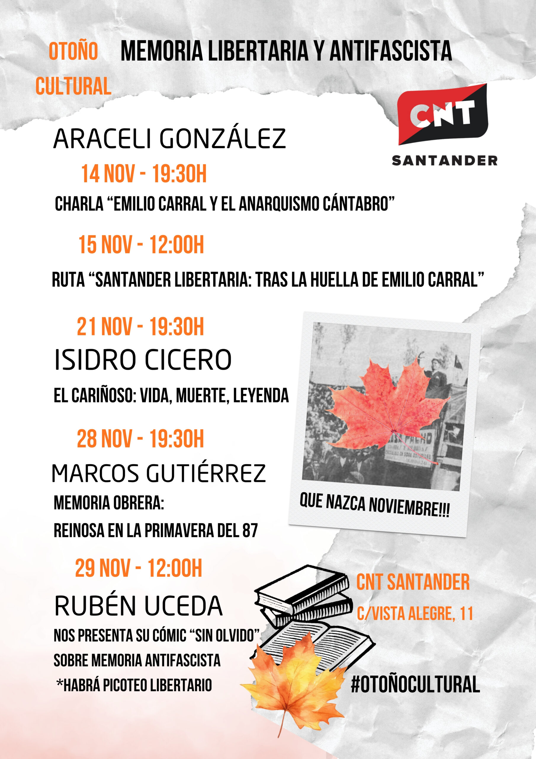 Del 14 al 29 de noviembre celebramos las jornadas «Otoño Cultural: Memoria Libertaria y Antifascista». Enmarcamos el aniversario en torno a la muerte de Durruti con charlas y actividades que fomenten la memoria e identidad del anarquismo en Cantabria.